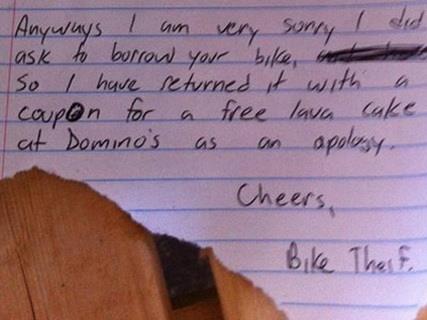 "Dragi vlasniče bicikla, U subotu sam diplomirao i ostao bez devojke. Otišao sam u bar i bilo je prekasno da uhvatim neki autobus, a za taksi nemam novca, pa sam pozajmio tvoj bicikl bez pitanja. U svakom slučaju, žao mi je što sam uzeo tvoj bicikl bez pitanja, pa ti ga vraćam sa kuponom za besplatan kolač u Domino's u znak izvinjenja.