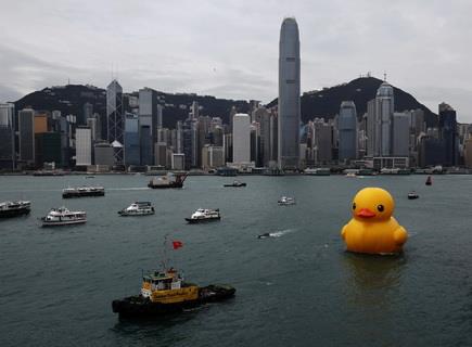 Gumena "patkica" visoka 16.5 metara, koju je dizajnirao Florentijn Hofman s ciljem da izmami ljudima osmeh na lice, uplovila je u luku "Victoria" u Hong Kongu.