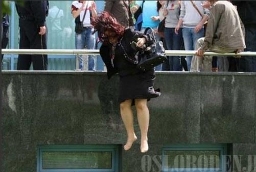 Fotoreporter Oslobođenja uhvatio je sjajan trenutak u kojem je jedna gospođa napustila zgradu Parlamentarne skupštine BiH tako što je skinula štikle, zakoračila i preskočila zid, jer su stepenice bile okupirane nezadovoljnim građanima.