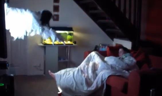 Kada je sve namestio, popeo se na sprat i krenuo da pušta zvuke koje bi trebalo da ispušta duh. Kada se njegova devojka probudila, krenula je momentalno da vrišti i da se pokriva jorganom.