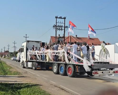 Ono što ovu svadbu izdvaja od brojnih drugih jeste nesvakidašnji izbor prevoza – gosti su, naime, odlučili da na venčanje stignu kamionom. Vesela povorka se ukrcala na ukrašenu prikolicu, a dok je vozač kamiona upravljao putem, zvanice su igrale i slavile u ritmu muzike.