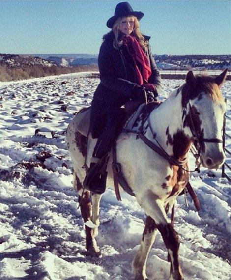 Potpuno samouvereno, Klumova je jahala braon belog konja po imenu Čarli i uživala u zadivljujućem okruženju.
