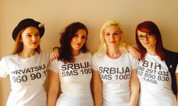 Obučene u 4 bele majice na kojima pišu bojevi telefona na koji građani mogu poslati poruke za Srbiju, BiH i Hrvatsku.