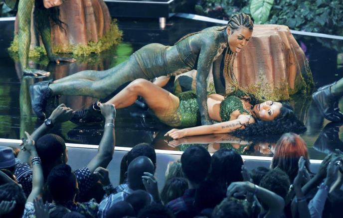 Nešto ranije na crvenom tepihu, Sajrus je rekla da je odlučila da prestane sa eksplicitnim plesnim pokretima ali je za razliku od nje, reperka Niki Minaž upravo sa takvim pokretima otvorila feštu pesmom "Anaconda".