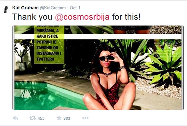 Glumica, pevačica i model Ket Grejem javno se zahvalila srpskom izdanju magazina Cosmopolitan. U trenutku kada je ugledala svoj modni editorijal na stranama popularnog Cosma, odmah je na Tviteru napisala “Thank you @cosmosrbija for this!”. Ona inače ima 1.840.000 pratilaca na Tviteru i obožava društvene mreže, pa će ovo biti još jedna pozitivna slika naše zemlje i dodatna promocija najpoznatijeg ženskog magazina.
