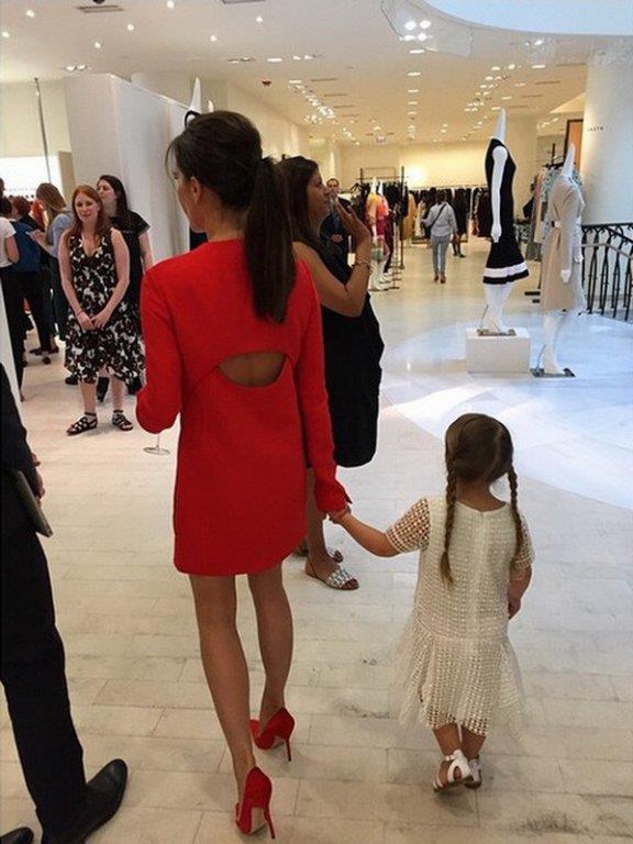 Viktoria je izgledala odlično, obučena u crvenu haljinu i odgovarajuće cipele istakla je svoje duge noge i vitku liniju, dok je malena Harper bila obučena u belo od glave do pete.