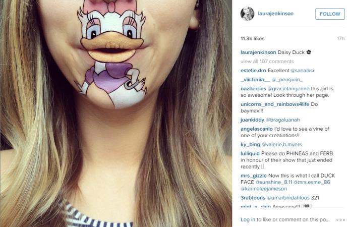 Profesionalna šminkerka Lora Dženkinson iz Londona rešila je da se pozabavi. Ona šminkom i karminima koji se koriste u pozorištu kreira portrete likova iz crtanih filmova. I to na svom licu, tačnije, usnama. Ova zanimljiva umetnička dela deli na Instagramu jednom nedeljno.