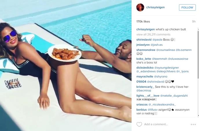 Ovoga puta je pozirala pored bazena, a na kukovima su joj bil pileća krilca koje je pevač pokušao da dohvati.