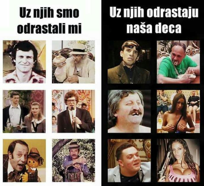 Decu su nekada vaspitali Branko Kockica, Raša Popov, Metla bez drške, Minja Subota, kultna emisija Na slovo na slovo i Priče iz Nepričave. Na površinu su danas isplivale osobe niskog društvenog stausa, Ekrem Jevrić, Zmaj od Šipova, Radašin , Maca Dikskrecija, Gastoz i Soraja, koji zauzimaju udarne termine televizija sa nacionalnom frekvencijom. Njih danas gledamo na televiziji, a taj uticaj na odrastanje najmlađih, dugoročno, biće poguban...