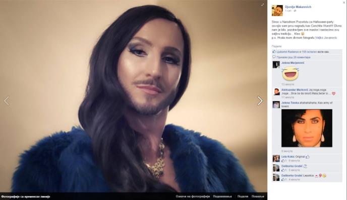 "Sinoć u Narodnom Pozorištu za Halloween - party osvojio sam prvu nagradu kao Conchita Wurst!!! Divno nam je bilo, pozdravljam sve maske i nastavimo ovu šaljivu tradiciju... Kiss", napisao je poznati baletan.