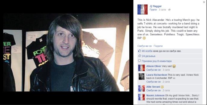 "Ovo je Nik Aleksandar. On je pomoćnik tokom turneje - prodavao je majice na koncertu. Radi za bend, radi posao koji voli a brutalno je ubijen u Parizu. Jednostavno je radio svoj posao. Ovo je mogao da bude bilo ko od nas. Besmisleno. Besmisleno. Tragično. Bez teksta. Počivaj u miru", piše na društvenim mrežama pored fotografije nastradalog momka.