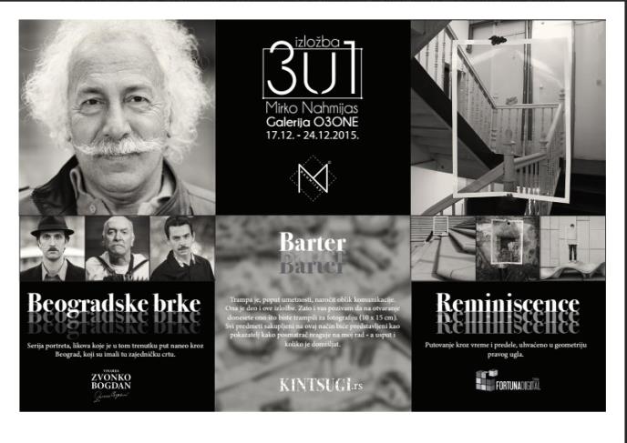 Izložba fotografija “3 u 1” beogradskog fotografa Mirka Nahmijasa, biće otvorena 17. decembra 2015. godine, u Galeriji O3ONE, u Uzun Mirkovoj 10