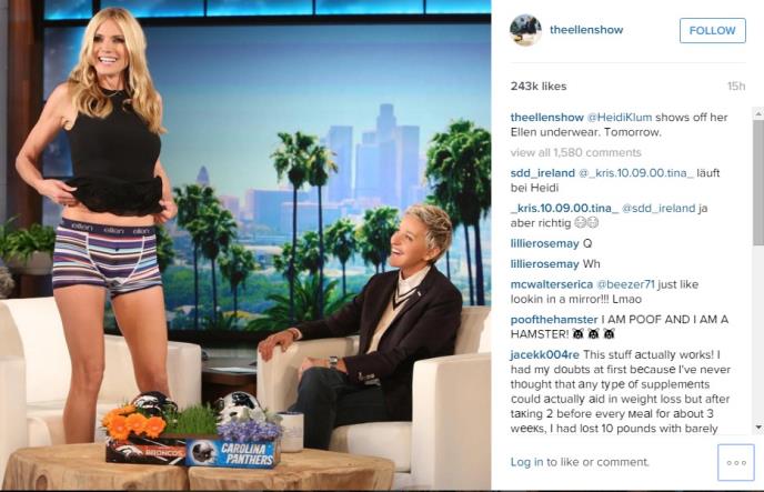 To je svakako bio slučaj sa gostovanjem Hajdi Klum u novoj emisiji Elen, jer je slavna manekenka odlučila da pokaže svima kako joj stoje gaće koje je dobila na poklon od voditeljke.