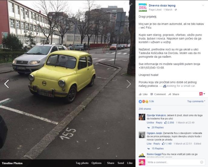 "Dragi prijatelji, moj san je bio da imam automobil, ali ne bilo kakav - već Fiću. Kupio sam starog, popravio, ofarbao, uložio puno truda, ljubavi i novca. Napokon sam počeo da ga koristim i uživam u vožnji. Nažalost, prethodne noći su mi ga ukrali u ulici Tadeuša Košćuška na Dorćolu. Molim vas da mi pomognete da ga nađem", piše u statusu na Fejsbuku.