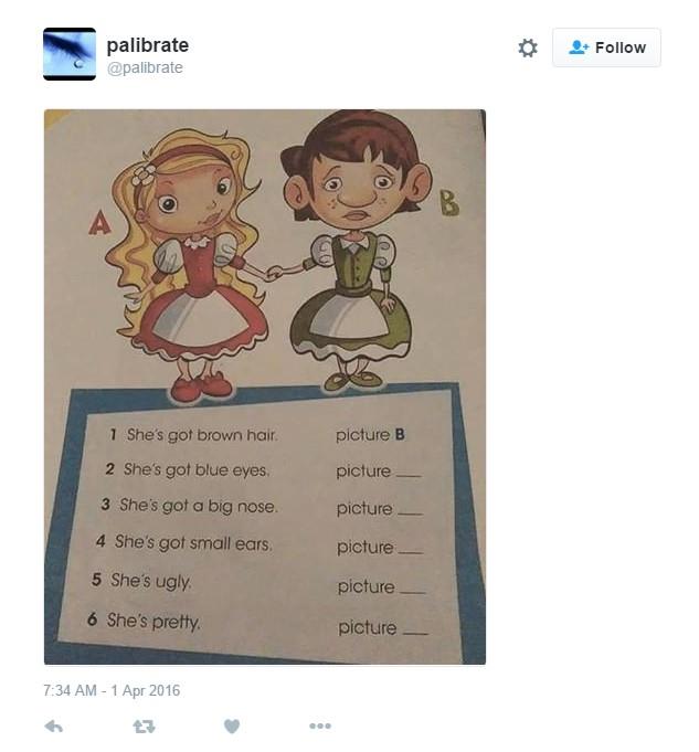 U udžbeniku 'Smileys 2' nalazi se potpuno neprimerena vežba u kojoj deca moraju da proceniti koja je od dve nacrtane devojčice 'lepa' i 'ružna'.