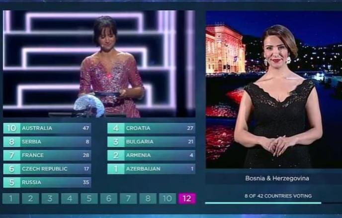 Bosna i Hercegovina je 10 poena dala Australiji, 8 Srbiji, 7 Francuskoj, 6 Češkoj, Rusiji 5, Hrvatska 4, Bugarska 3, Armenija 2 i Azebejdžan 1.
