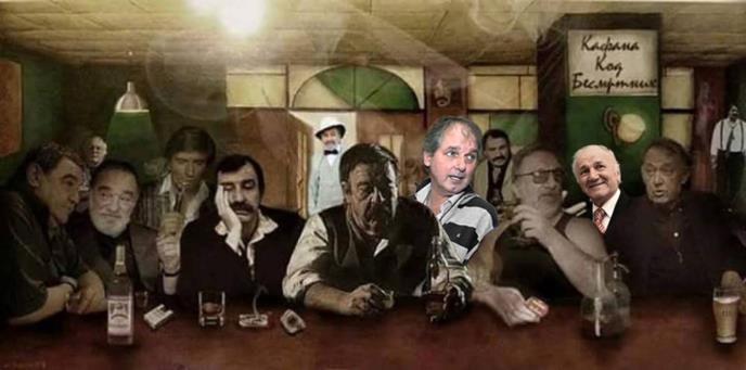 Na slici u kojoj veliki pokojni umetnici sede u kafani pridružio se i Manda, koji sad pravi društno Pavlu Vuisiću, Bati Stojkoviću, Zoranu Radmiloviću, Dušanu Prelevću Preletu, Momi Kaporu, Tomi Zdravkoviću, Josifu Tatiću, Bori Todoroviu, Peri Kralju, Draganu Nikoliću i Dragomiru Bojaniću Gidri.
