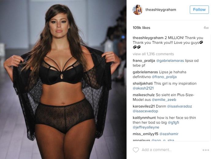 Ešli Grejem je izgradila ime u svetu manekenstva zahvaljujući svojim oblinama i činjenicom da je plus sajz manekenka i aktivistkinja koja promoviše činjenicu da bi se svaka žena trebala osećati dobro i ugodno u sopstvenoj koži i prihvatiti svoje telo bez obzira na suvišne kilograme.