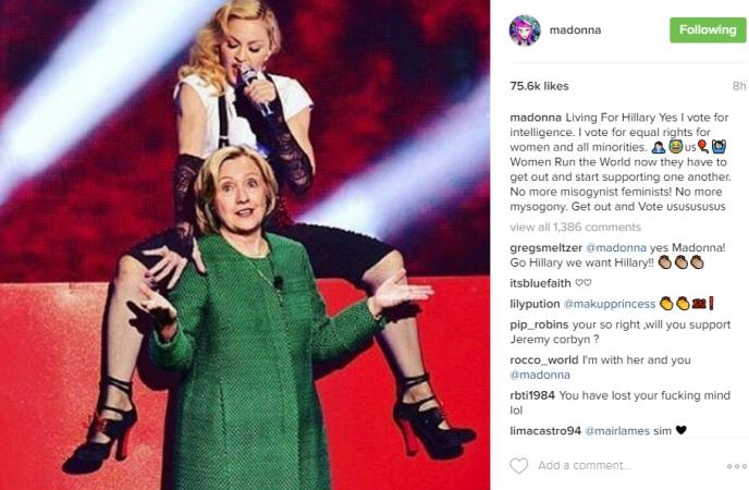 "Ja ću glasati za inteligenciju. Glasaću za jednaka prava žena i svih manjina. Žene upravljaju svetom, a sada moraju da istupe i podrže jedne druge. Izađite i glasajte" napisala je Madona i dodala da će glasati sa koleginicom.