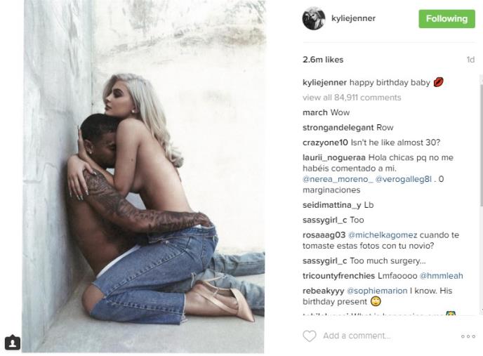 "Srećan rođendan, dušo" napisala je Kajli u opisu prve fotke koju je objavila na Instagramu, a na kojoj polugola pozira sa dečkom. Kajli je pozirala obučena samo u farmerke i u toplesu, a na slikama grli repera.