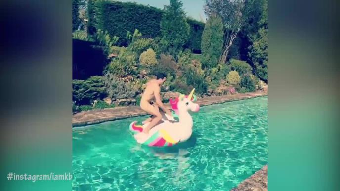 Na snimku Keli gola pozira na dušeku u obliku jednoroga, a društvo joj pravi dečko Džeremi Parisi.