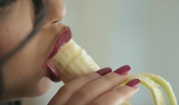 Pevačica liže bananu i glumi oralni seks ispred ploče u učionici.