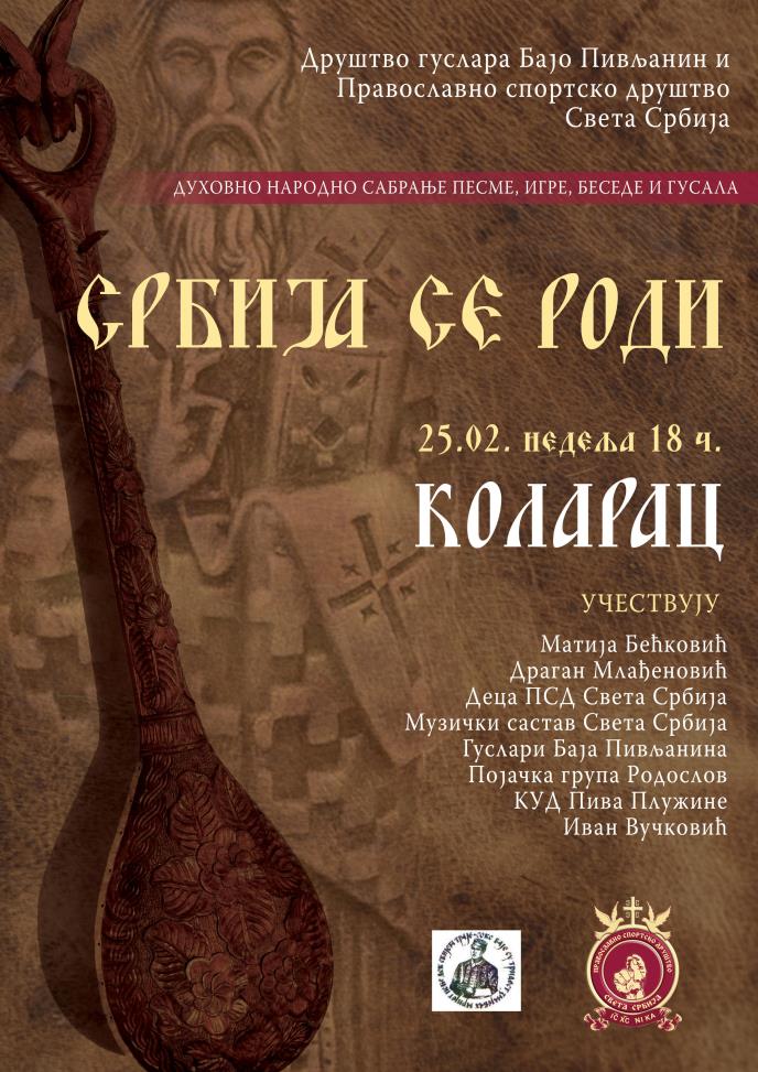 Društvo guslara Bajo Pivljanin i Pravoslavno sportsko društvo Sveta Srbija priređuju Duhovno sabranje pesme, igre, besede i gusala pod nazivom Srbija se rodi u Zadužbini Ilije Kolarca, na navečerje Praznika svetog Simeona Mirotočivog, u nedelju 25. februara 2018. godine. Početak koncerta zakazan je za 18 časova.