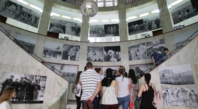Prvi posetioci već obilaze izložbu "Na krilima pobede - Novo doba nova dela", gde je prikazan deo bogate foto arhive od oko 3,5 miliona negativa.