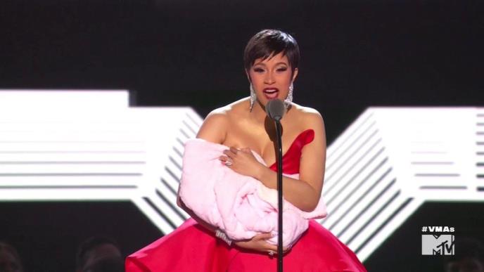 Kardi Bi, koja je nedavno pretila da će baciti svoju jednomesečnu ćerku na pod, sada je iznenadila javnost kada je odlučila da je podoji na bini, prilikom sinoć održane dodele MTV nagrada.