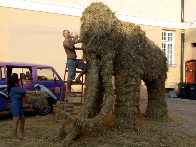 Dvorištem muzeja od nedelje uveče dominira mamut od slame. Skoro tri dana skulpturu je pravio Nikola Faler, vajar i predsednik udruženja "Slama" iz Osijeka.