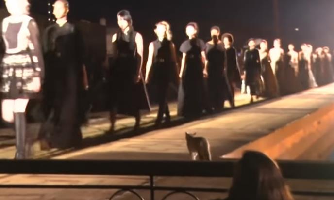 Mačka je hodala u suprotnom pravcu od modela, koji su nosili dugačke elegantne haljine, džeći se uporno svog smera i probijajući se prema publici koja je oduševljeno fotografisala i snimala ovaj prizor.