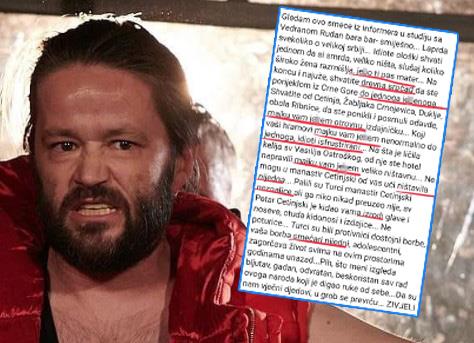 ''Na šta je ličila kelija Svetog Vasilija Ostroškog, od nje ste hotel napravili, majku vam j*bem velikoništavnu", nastavio je da vređa glumac Crnogorskog narodnog pozorišta dok Srbe karakteriše rečima: "Neznalice",
