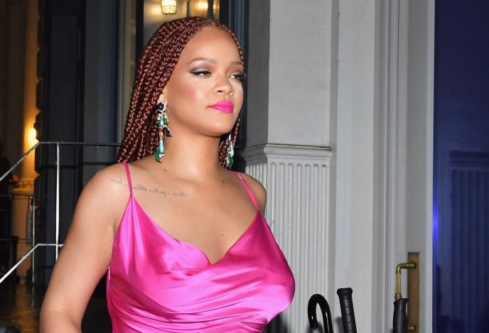 Rijana je obukla kratku roze satensku haljinu sa dubokim dekolteom, bez brusa. Uz nju je iskombinovala aksesoare u vidu zelenih minđuša, dijamanta na rukama, pa čak i na nozi. Frizura nije bila u skladu sa celokupnim izgledom. Pustila je dugu kosu crvenog tona sa mnoštvom pletenica.
