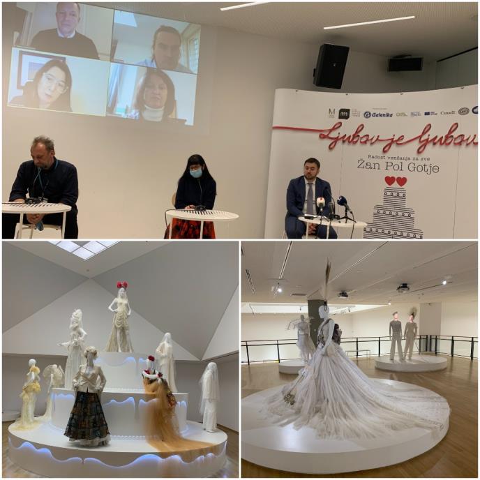 Na početku konferencije predstavnicima medija obratio se putem video-linka iz Pariza i Žan-Pol Gotje, koji je posebno pozdravio beogradsku publiku, istakavši da mu je jako žao što zbog pandemije nije i lično prisutan na otvaranju i da će do kraja izložbe u nekom momentu i doći u Beograd. Kanadski kustos Tjeri-Maksim Lorio istakao je da je beogradska postavka po mnogo čemu posebna i da je ovo prvi put da se pred očima javnosti nađe osam Gotjeovih venčanica koje nisu bile deo ranije postavke, kao i da je ovo prvi put da se ove haljine vide bez ikakve staklene zaštite, što nije slučaj s modnim izložbama.