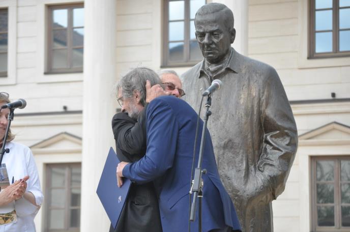 Uz bratske reči - Hvala ti brate, hvala ti brate, hvala ti brate, Emir Kusturica uručio je danas popodne u Andrićgradu austrijskom nobelovcu, velikom srpskom prijatelju, piscu Peteru Handkeu "Veliku nagradu Ivo Andrić".