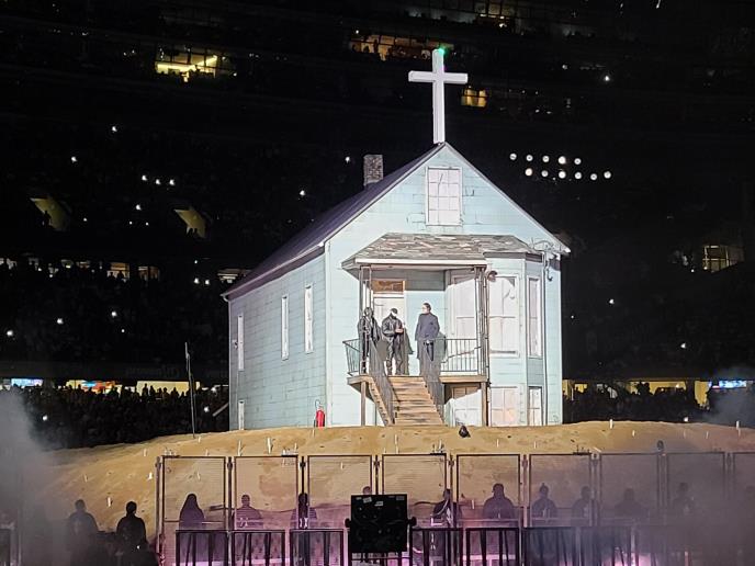 Sav u plamenu prošetao je setom koji je ličio na njegovu porodičnu kuću u kojoj je odrastao i gde je živela njegova majka Donda. Njegovi zaposleni su bili opremljeni aparatima za gašenje i zaustavili su vatru na vreme.