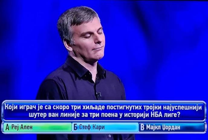 "Koji igrač je sa skoro tri hiljade postignutih trojki najuspešniji šuter van linije za tri poena u istoriji NBA lige?", glasilo je pitanje, dok su ponuđeni odgovori glasili - Rej Alen, Stef Kari, Majkl Džordan.