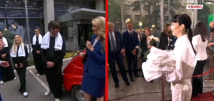 Ispred zgrade RTS u Takovskoj nalaze se i voditelji Stefan Popović i Kristina Radenković, u improvizovanom "grin rumu", gde su i parkirani crveni i beli "fića", kojima će srpska delegacija otputovati u Torino.