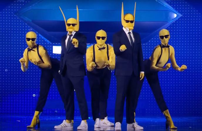 Nastupali su u crnim odelima s belim košuljama i sa žutim maskama nalik vučjim glavama, žutim rukavicama i kravatom, a pratio ih je DJ astronaut. Prošli su dalje u finale s pesmom ''Give That Wolf A Banana'' ("Daj tom vuku bananu").