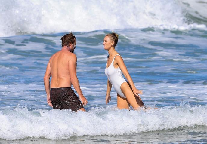 Sajmon, koji se poslednjih meseci pomalo i zapustio, snimljen je u crnim kupaćim gaćicama, a u oči je upala njegova neuredna i pomalo proseda brada, dok je njegova navodna jevojka vitku figuru istaknula jednodelnim belim kupaćim kostimom.