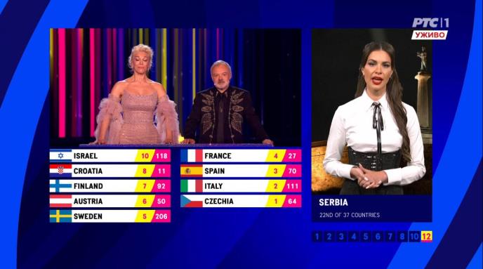 Srbija je 12 poena dala Sloveniji, dok su ostali poeni raspoređeni na sledeći način: 10 poena dobio je Izrael, 8 Hrvatska, 7 finska, 6 Austrija, 5 poena dobila je Švedska, 4 Francuska, Španija 3 poena, dok su dva i jedan poena dobile Italija i Češka.