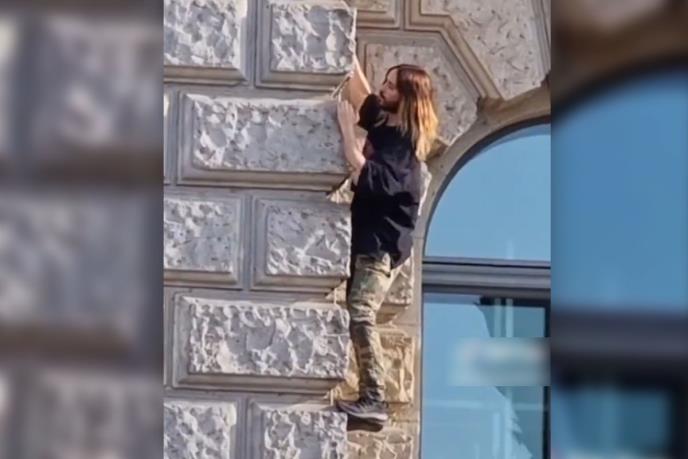 Džared Leto (51), zvezda filmova "Gučijevi" i "Morbius", snimljen je u ponedeljak u Berlinu kako visi sa zidina "Hotel de Rome" dok su se zaprepašćeni prolaznici gledali da se ne oklizne i padne.