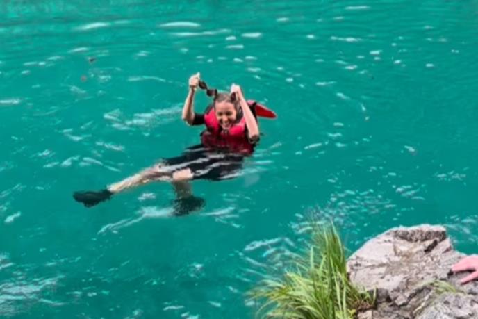 Jelena je nosila odelo za rafting, a plivala je vrlo oprezno trudeći se da ne pokvasi kosu te je pletenice sve vreme držala iznad glave, što je nasmejalo sve pratioce, alo i ljude oko nje.