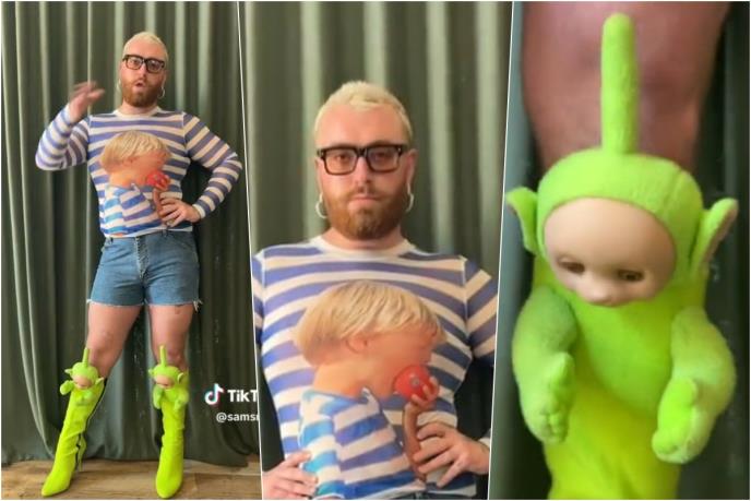Smit na videu pozira u kratkim pantalonama, prugastoj majici s likom dečaka koji grize jabuku i zelenim štiklama koje na sebi imaju plišane Teletabise, odnosno likove Dipsija.