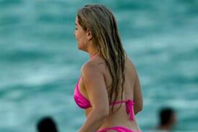 Paparacii su je tamo uhvatili u pravim trenucima, dok je uz zalazak sunca pozirala u plićaku za društvene mreže. Nosila je minijaturni roze bikiniu kojem je istakla svoje prirodne obline i bujnu utreniranu zadnjicu, koju je gurnula u prednji plan.