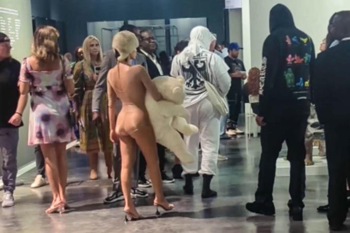 Najnovije fotografije Bjanke koje su zabeležene na umetničkoj galeriji u Majamiju ponovo su izazvale reakcije u medijima i na društvenim mrežama. Naime, pojavila se se u uzanom kostimu u boji kože, a u ruci je nosila velikog plišanog medveda. Kanje Vest pored nje imao je obmotanu belu maramu oko glave i prisutni su par gledali u potpunom čudu.