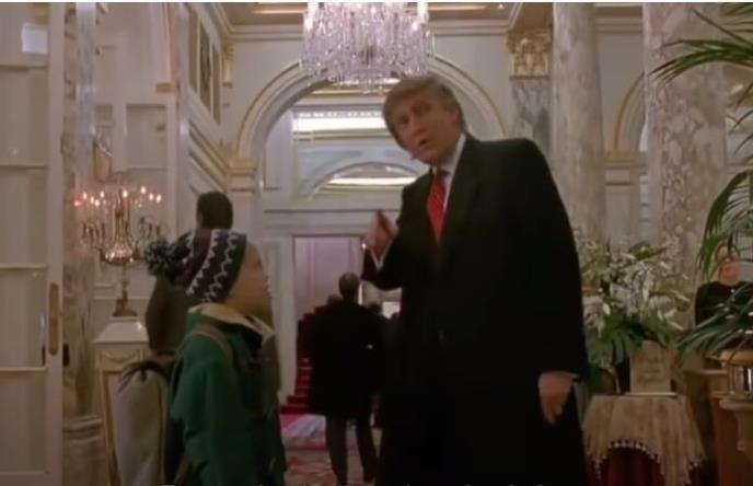 U jednoj od najneobičnijih scena ovog božićnog klasika, Kevin Mekalister se izgubi u prostranim hodnicima hotela Plaza. Zatim pita prvog stranca za upustva, a to je glavom i bradom Tramp.