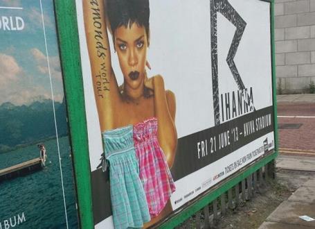 Stanovnici Dablina nisu oduševljeni plakatima koji najavljuju Rijanin koncert, pa su njih nekoliko na mesto grudi odlučili da okače odeću