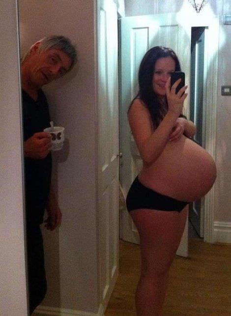Nasmejana Hana Endjuz (25) je ispod slike napisala "Pogledajte kolika sam?!!", a na slici se može videti i Veler (55) koji u domaćinskom izdanju pijucka kafu dok se njegova mlada žena slika u ogledalu.