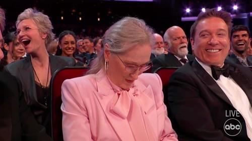 Glumac Rob Makelheni i njegova supruga, glumica Kejtlin Olson, predstavljali su nagradu za izvanrednu sporednu glumicu u humorističkoj seriji, a u toj kategoriji je bila nominovana i Strip za ulogu u seriji "Only Murders in the Building". Njih dvoje su odlučili da se našale s Meril i uporedili sa štitnikom za genitalije.
